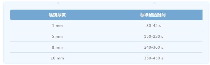 依據(jù)標準玻璃加熱容量,每1mm厚的玻璃加熱時間是30-45s,即5mm玻璃的標準加熱時間150-220s,8mm玻璃的標準加熱時間是240-360s,10mm玻璃的標準加熱時間是350-450s。